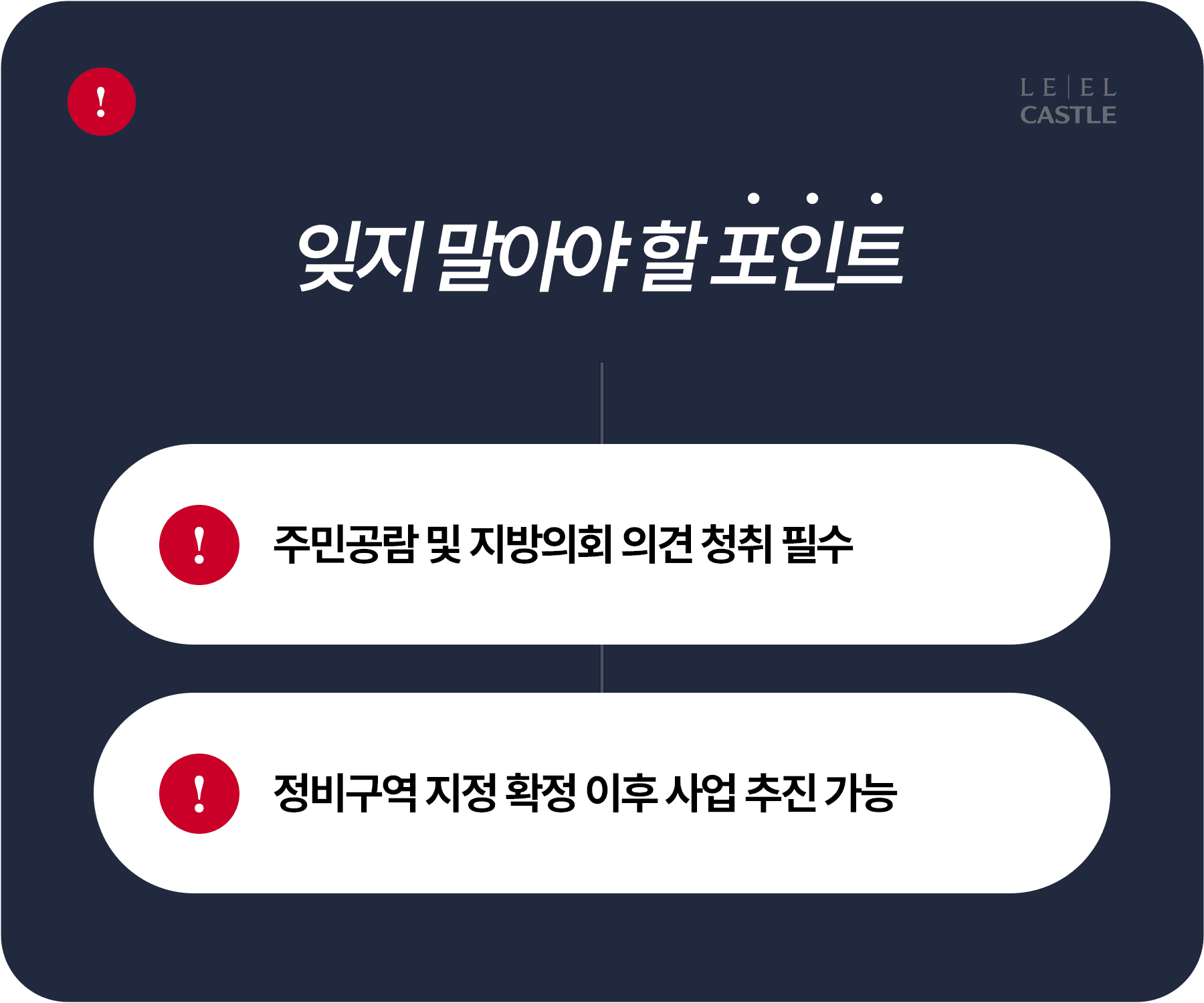 ✔️ 주민 공람(최소 30일): 주민 개인이 계획을 직접 살펴보고 의견을 낼 수 있습니다. ✔️ 지방의회 의견 청취(60일 이내): 지방 의회는 60일 이내 검토 의견을 회신합니다. ✔️ 회신이 없으면 ‘의견 없음’으로 간주해 다음 절차로 넘어갑니다. ✔️ 도시계획위원회 심의: 사업 타당성 및 실행 가능성을 법적·기술적으로 검토합니다. ✔️ 정비구역 지정: 확정되어야 이후 사업 추진 가능